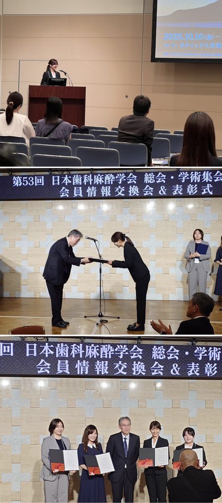 10月10~12日に開催された第53回日本歯科麻酔学会において、当講座の林 里映大学院生が日本歯科麻酔学会最優秀発表賞にあたる「ジーシー昭和薬品賞」を受賞しました。